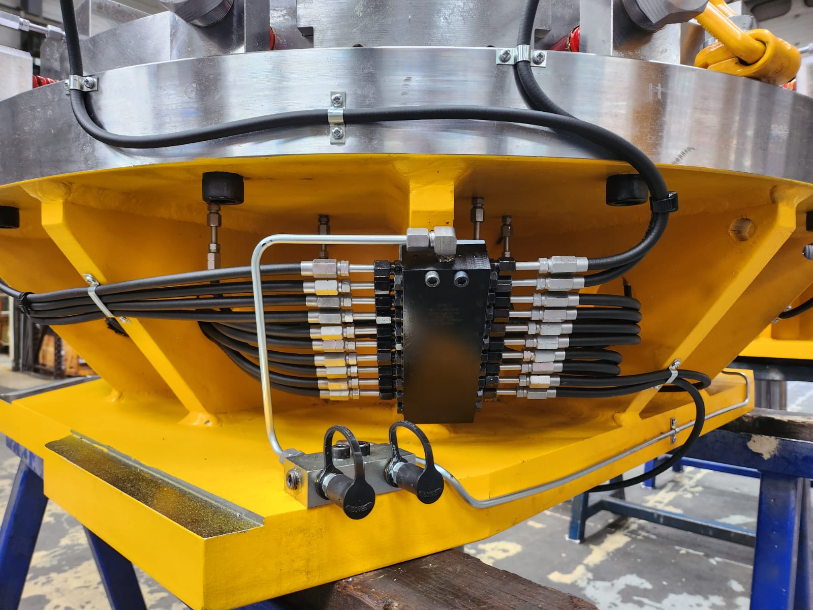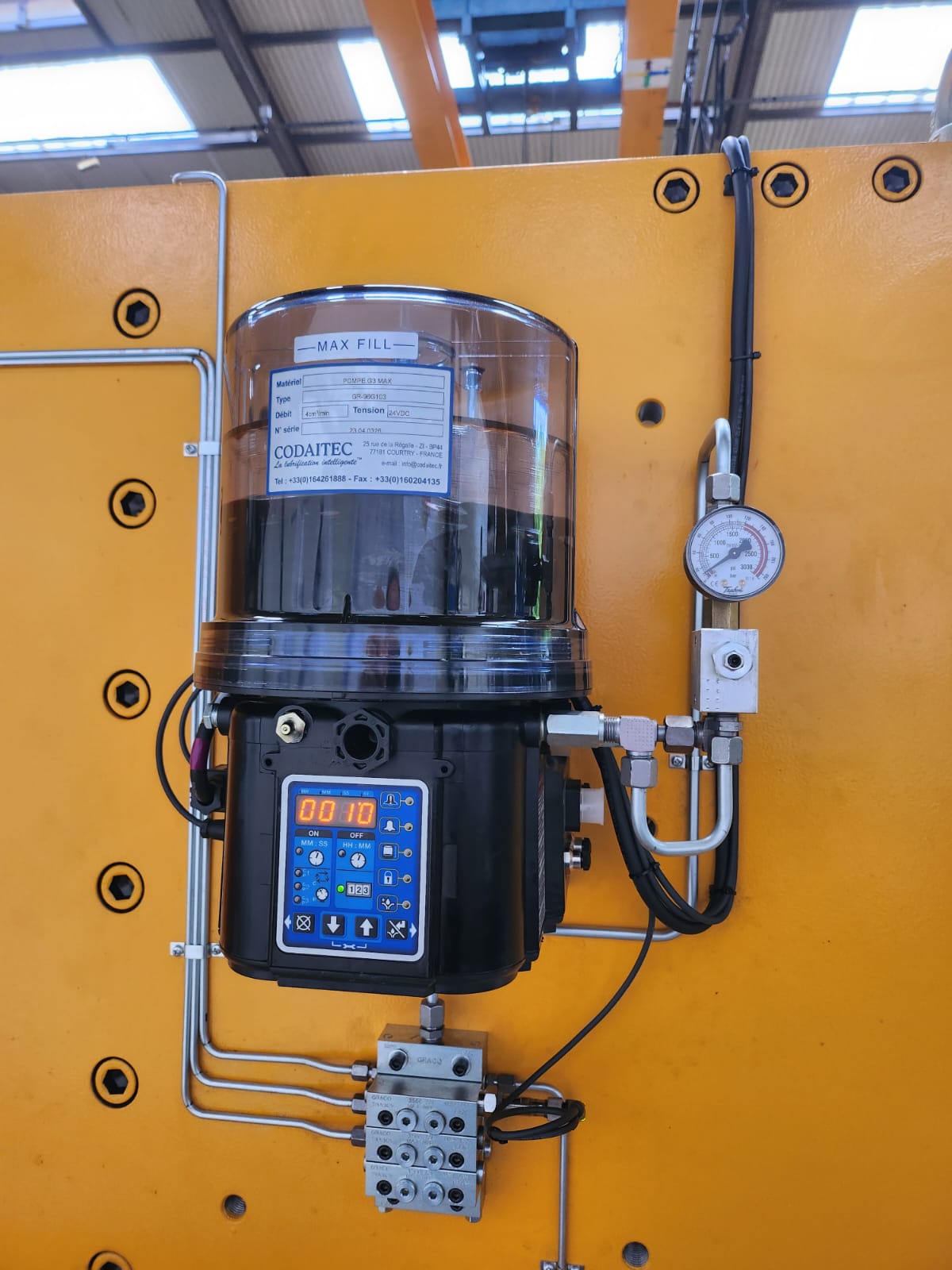 Système de graissage automatique progressif pour alimenter 46 pts de lubrification sur Calibreuse de roues matériel Agricole.