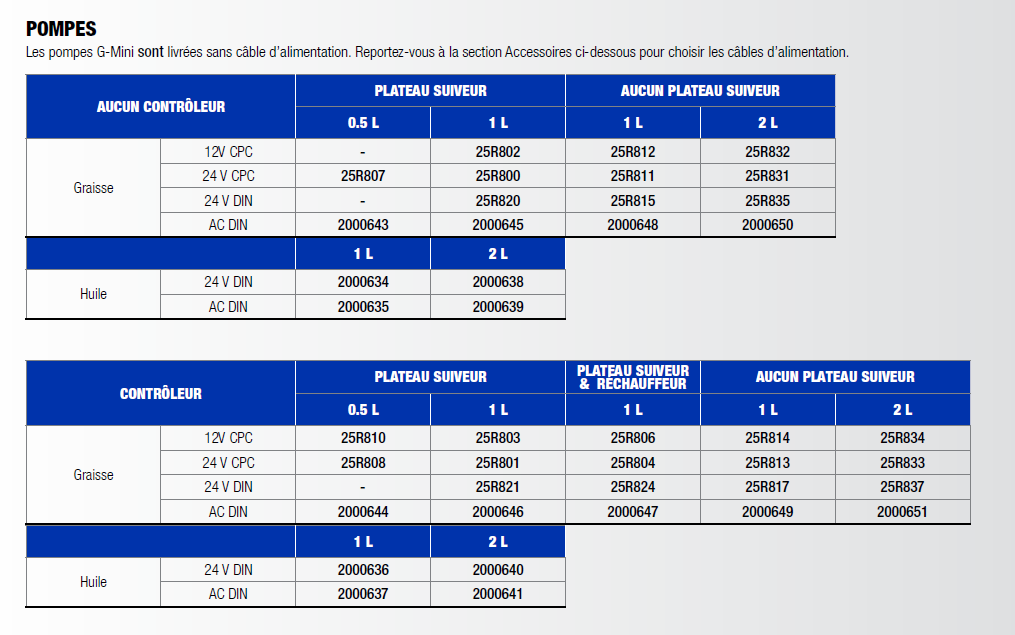 D'autres options (niveau bas, plateau suiveur, réchauffeur) permettent de définir un modèle exact dans le tableau de séléction présent en bas de page.